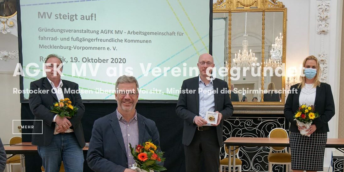 Mecklenburg Vorpommern hat eine neue Institution zur Förderung des Rad- und Fußverkehrs. Am 19. Oktober 2020 wurde im Rostocker Barocksaal der Verein „AGFK MV – Arbeitsgemeinschaft fahrrad- und fußgängerfreundliche Kommunen Mecklenburg-Vorpommern e. V.“ gegründet. Zum Schirmherrn des Vereins wurde Minister Christian Pegel ernannt, zum ersten Vorstandsvorsitzenden wurde der Rostocker Oberbürgermeister Claus-Ruhe Madsen gewählt.