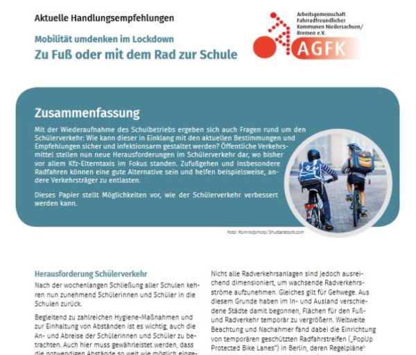 Ein neues Papier der Kollegen der AGFK Niedersachsen/Bremen stellt verschiedene Möglichkeiten vor, wie der Schülerverkehr verbessert werden kann. Bannmeilen für Kraftfahrzeuge einrichten Fahrradparksituation verbessern Bonussysteme zur Motivation einführen Alternativen zur Schulbusnutzung aufzeigen Hier geht es zum Papier. Zur AGFK Niedersachsen/Bremen.