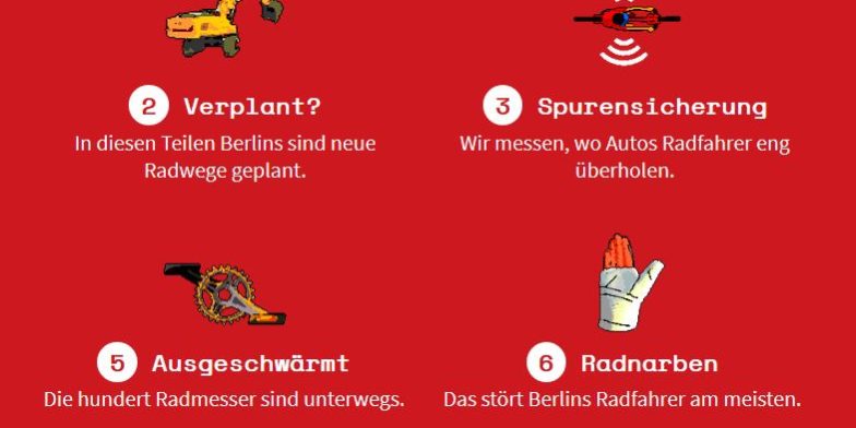 Wunderschön grafisch aufbereitet und ein echter Genuss. Der Berliner Tagesspiegel veröffentlicht Daten und Fakten zum Radverkehr. Besonders Interessant: Die Befahrung der Stadt mit Messgeräten. Diese messen den Abstand der Autofahrer beim Überholen. Die Ergebnisse kann jeder Radfahrer und jede Radfahrerin in Berlin nur bestätigen. Danke an Uwe Redecker für den Tipp.