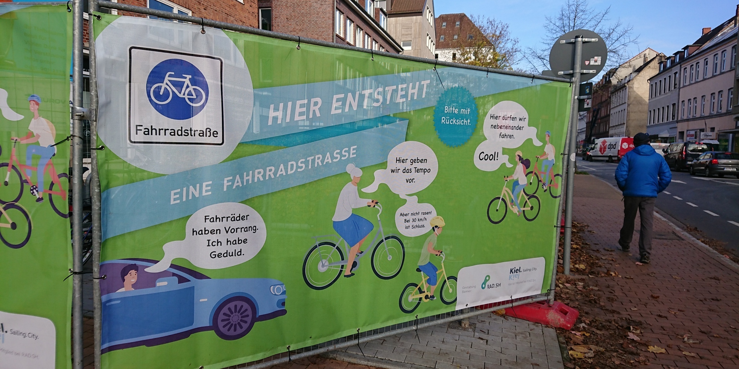 Ein schönes Beispiel für die Verwendung eines unserer Kommunikationspakete bietet derzeit Kiel. Beim Bau einer neuer Radstraße nutzt die Stadt unsere Vorlagen, um gleich die neuen Regelungen und die Straße selber zu bewerben.