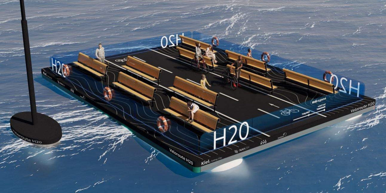 Mit „Veloroute H20“ hat der Muthesius-Absolvent ein Fährsystem für Fahrräder konzipiert, das die beiden Seiten der Kieler Innenstadt miteinander verbindet. Eine elektrische, autonome Fähre transportiert Fahrradfahrende, angetrieben von Wind- und Gezeitenturbinen, über die Kieler Förde. Der schwimmende Radweg ergänzt das Radwegenetzwerk Kiels, sodass Kieler*innen für die Überquerung der Förde nicht mehr auf Umwege mittels öffentlichem Nahverkehr oder Auto angewiesen sind.