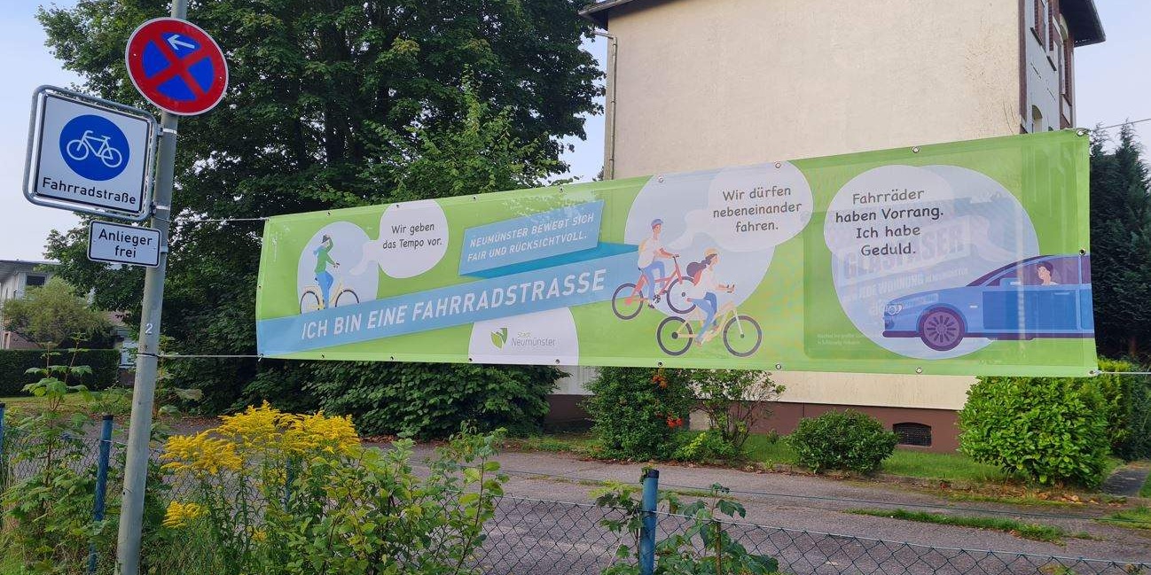 Der Pestalozziweg in Neumünster ist die 4. Fahrradstraße der Stadt. Für die Einweihung griff die Stadt auf die Materialien von RAD.SH zurück.