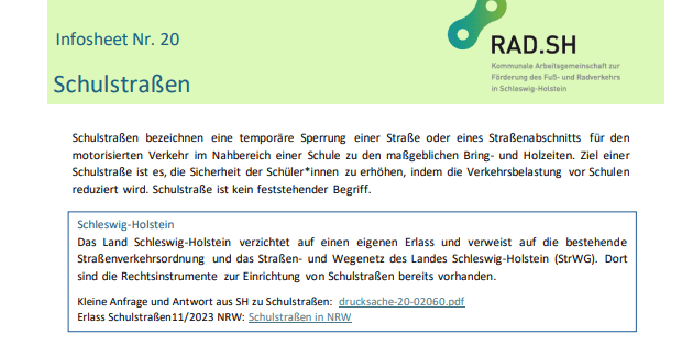 In immer mehr Bundesländern werden Schulstraßen erprobt und eingerichtet, um das morgendliche Verkehrschaos zu entschärfen und den Schulweg sicherer zu machen. Worauf es bei der Einrichtung von Schulstraßen ankommt und welche rechtlichen Rahmenbedingungen zu beachten sind, erläutert dieses Infosheet.