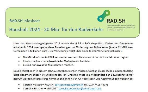 Apr.262024 RAD.SH Infosheet: § 33 a FAG – 20 Mio. für den Radverkehr Fördermittelberatung26. April 2024 weiterlesen