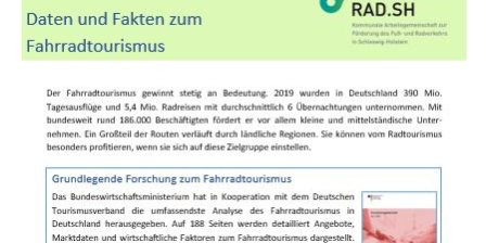 Der Fahrradtourismus gewinnt stetig an Bedeutung. 2019 wurden in Deutschland 390 Mio. Tagesausflüge und 5,4 Mio. Radreisen mit durchschnittlich 6 Übernachtungen unternommen. Mit bundesweit rund 186.000 Beschäftigten fördert er vor allem kleine und mittelständische Unternehmen. Ein Großteil der Routen verläuft durch ländliche Regionen. Sie können vom Radtourismus besonders profitieren, wenn sie sich auf diese Zielgruppe einstellen.