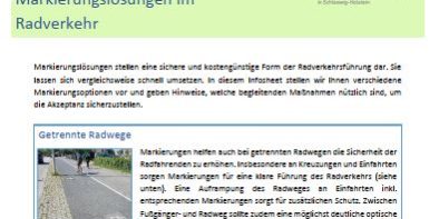 Markierungslösungen stellen eine sichere und kostengünstige Form der Radverkehrsführung dar. Sie lassen sich vergleichsweise schnell umsetzen. In diesem Infosheet stellen wir Ihnen verschiedene Markierungsoptionen vor und geben Hinweise, welche begleitenden Maßnahmen nützlich sind, um die Akzeptanz sicherzustellen.