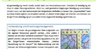 Bürgerbeteiligung macht Arbeit, kostet Geld und Personalressourcen. Trotzdem ist Beteiligung ein Muss in vielen Planungsverfahren. Nicht nur, weil gesetzliche Regelungen Beteiligung vorschreiben, sondern auch, um den Sachverstand der BürgerInnen einfließen zu lassen. Der „Expertenblick“ kann auf diese Weise ergänzt und erweitert werden. In diesem Sheet zeigen wir Chancen und Grenzen von Bürger*innen-Beteiligung auf und stellen Ihnen abgestufte Beteiligungsformate vor.