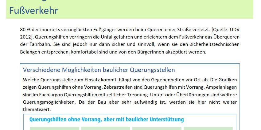 80 % der innerorts verunglückten Fußgänger werden beim Queren einer Straße verletzt. [Quelle: UDV 2012]. Querungshilfen verringern die Unfallgefahren und erleichtern dem Fußverkehr das Überqueren der Fahrbahn. Sie sind jedoch nur dann sicher und sinnvoll, wenn sie den sicherheitstechnischen Belangen entsprechen, komfortabel sind und von den BürgerInnen akzeptiert werden.