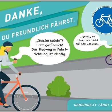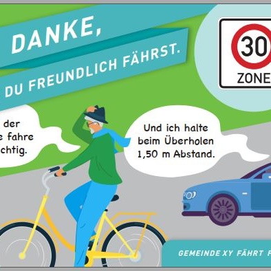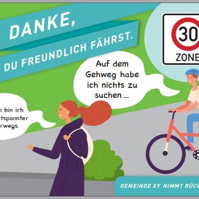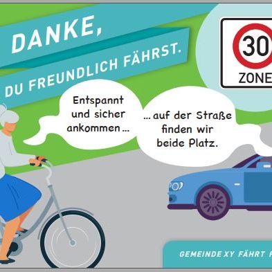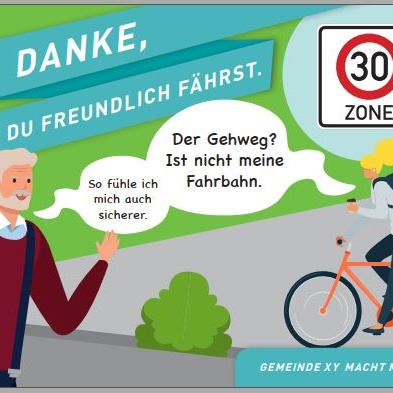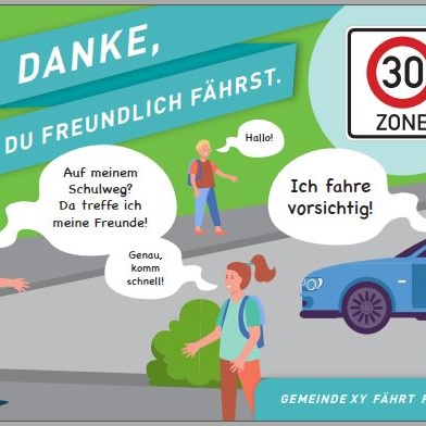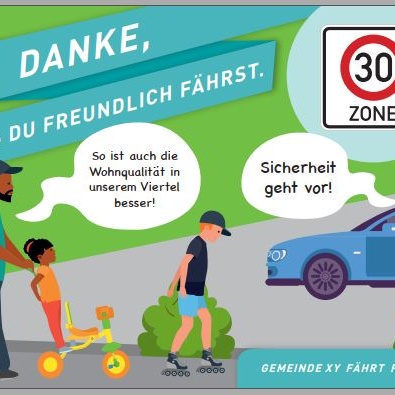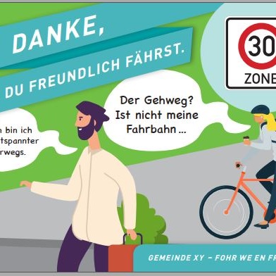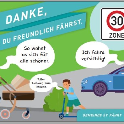 Unser Kommunikationspaket besteht aus einer Flyervorlage, Postkarten, Straßen- und Bauzaunbanner, sowie Posts für den Social-Media Accout der eigenen Kommune. Die Materialien sind vielfältig einsetzbar. Um allgemein auf das Thema hinzuweisen, die Einführung einer Tempo 30 Zone zu begleiten etc… Gerne beraten wir hier und fügen neue Ideen hinzu.